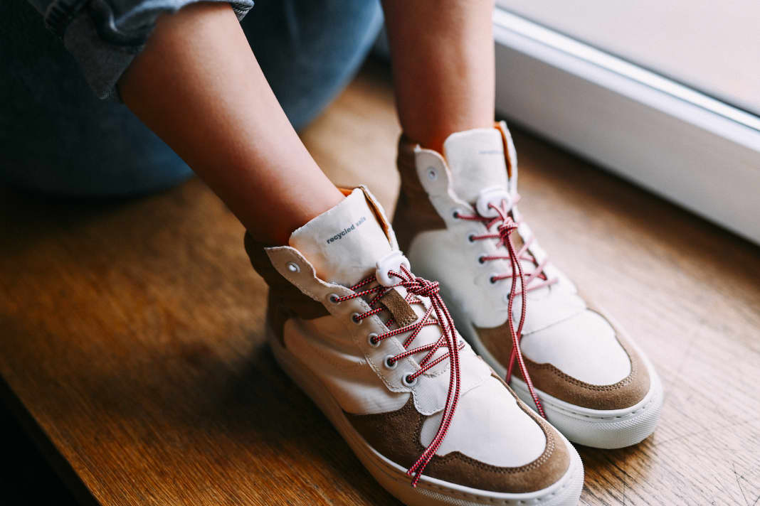 High Top Sneaker für Damen und Herren von 8beaufort.Hamburg, gefertigt aus recyceltem Segeltuch, recycelter Baumwolle, Veloursleder und elastischen Schnürsenkeln, in Weiß, Ozeanblau und earth. Nachhaltiger können Dich Deine Füße nicht tragen!