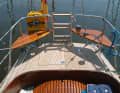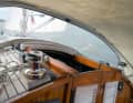 The Biga is agile and easy to steer with the tiller and impresses with its good sailing characteristics. The crew sits protected behind the high coaming in the deep, self-draining cockpit. In combination with the large sprayhood, this ensures relatively dry sailing. The distance between the cockpit benches allows good support with the feet when the "Aquamare" is shifting. The floor of the spacious cockpit, like the deck, is made of solid teak rods glued to marine plywood. Halyards and reefing lines are redirected into the cockpit, which means that you do not have to leave the cockpit to operate the sails; this was important to the first owner for safety reasons and was therefore his express wish.