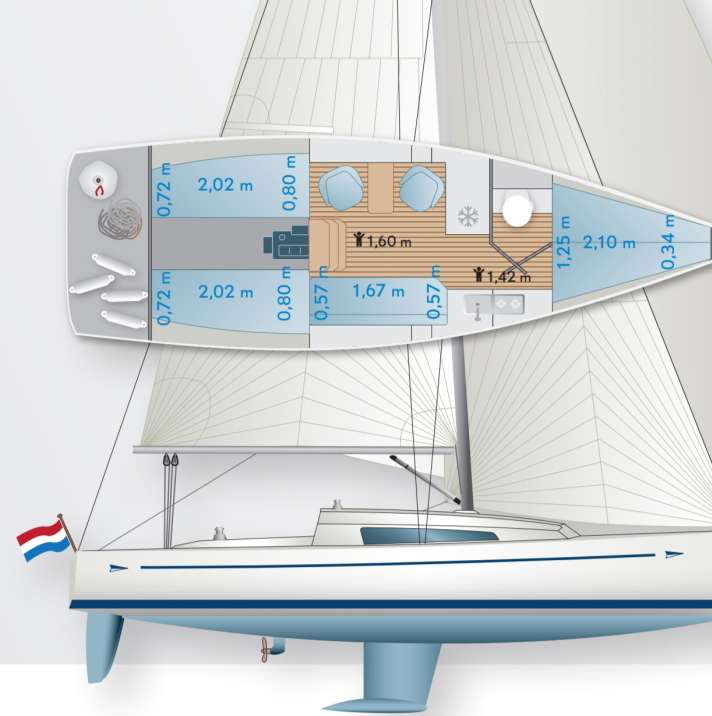 Le vele non sono incluse nella fornitura. Il cliente può scegliere tra un fiocco autovirante e un genoa. Il set di vele in Dacron (randa e fiocco) costa 4.850 euro in più.