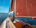 Krumme e Zimmermann tirano le classiche cime d'ormeggio e lasciano il porto. La randa marrone viene rapidamente regolata, quindi il fiocco e la trinchetta vengono avvolti. Tutte le drizze e le scotte possono essere manovrate dal pozzetto. L'affidabile stabilità direzionale della chiglia lunga contribuisce anche all'idoneità del "Potvis" a navigare in solitario.